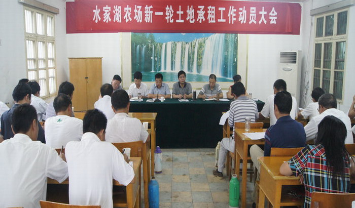 830,水家湖农场党委召开新一轮土地承租工作动员大会,场领导及机关各部门、各农业分场、专业公司负责人参加了会议。会上宣读了《2011—2016年土地承租工作实施方案》,会议从工作背景、组织领导、方案形成、稳步推进等方面明确了此次土地承租工作的目标任务、方法步骤和具体要求。会议要求,全场上下要把思想认识统一到党委决策部署上来,与党委保持高度一致,切实提高工作执行力,确保秋种前圆满完成。今后一个阶段,要组织学习和广泛宣传实施方案,分场班子和包点干部要统一思想,组织开好三个层面的诸葛亮会议,即开好决策层会议,分场班子和包点干部共同研究制定分场实施细则;开好党员骨干会议,征求党员代表、职工代表等各方面意见,集中民智;开好职工群众大会,广泛征求意见建议,优化落实分场实施细则,做好宣传动员工作,同时,要把握好大稳定政策,严格遵守工作程序。场长刘国强在讲话时强调,一是要吃透政策、掌握政策、用好政策。分场在制定实施细则时,要首先摸清土地资源和承租人员情况,把握重点,刚柔并济,慎对难题;二是要广泛参与、明确责任、限期完成。分场是责任主体,各包点部门要全力配合,在规定时间内推行到位。刘国强还就新一轮土地承租中大家关注的非职工承租土地、管理人员退出租地、两个管理区上缴指标差异等焦点问题,向与会人员作了解释说明。