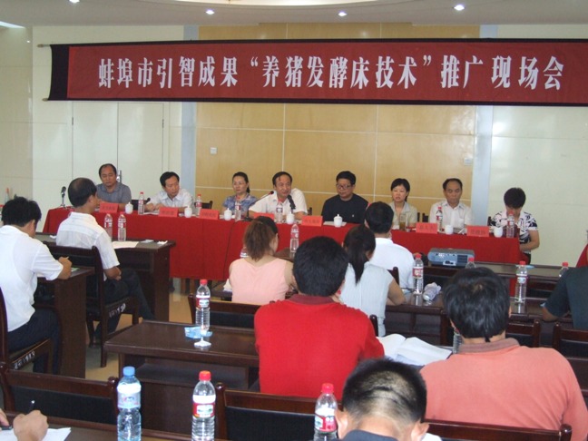 发酵床也叫生态床,利用全新的自然农业理念,结合现代微生物发酵处理技术提出的一种环保、安全、有效的生态养猪法。实现养猪无排放、无污染、无臭气、彻底解决规模养猪场的环境污染问题,它是集养猪学、营养学、环境卫生学、生物学、土壤肥料学于一体,遵循低成本、高产出、无污染的原则建立起的一套良性循环的生态养猪体系。它是工厂规模化养猪发展到一定阶段而形成的又一亮点,是养猪业安徽农垦集团的新模式。该技术在蚌埠市养殖业中积累了宝贵的成功经验,为把此项技术深入推广,带动更多的养殖户增收致富,蚌埠市特举办了此次现场推广会。
