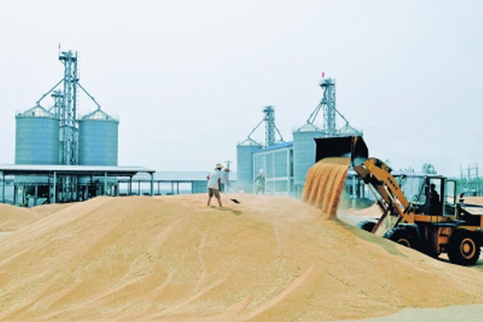 安徽垦区全面落实各项先进的农业生产技术措施,战胜了去冬今春小麦生长前期低温多雨、后期干旱的天气影响和小麦病虫害发生,迎来了又一个丰收年。预计全系统小麦平均亩产可达425公斤,其中沿淮农场全面实现了万亩千斤高产目标,良种率达百分之百,实现了夏粮连续八年增产。图为龙亢农场正在晾晒归仓小麦。(农民日报6月21日01版 鲍广云摄)