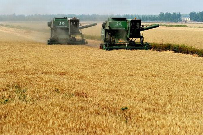 在龙亢农场良种基地,成熟的小麦等待专机的收割。