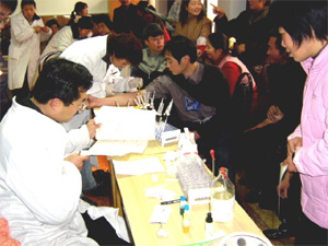 数九隆冬,天气异常寒冷,采血点——机关办公楼 四楼会议室内却是热火朝天,暖意融融。从各单位 冒雨赶来的无偿献血者挤满了一屋子。徐成银场长 带头报名献血,大家不顾寒冷,争相验血、抽血, 场面令人感动。献血的人群中,有场领导、一般干 部、党员、教师、医务工作者、普通工人,还有夫 妻、兄弟、姐妹,双双同时赶来献血。献血,对于 大多数农场人来说还是第一次,特别是一些女同 志,看着粗大的抽血针头和一股股流出的殷红血 液,尽管心里有些害怕,但是一想到自己的一次无 偿献血有可能挽救起的是一条垂危生命时,还是毫 不犹豫地捋起袖管……抽血的医院人员感动的说: 我们到过不少地方开展无偿献血活动,都没有你们 大圹圩农场人这么积极踊跃,农场人思想境界真 高!