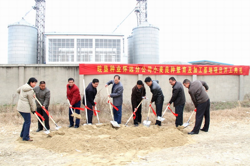 皖垦种业怀远分公司小麦良种基地项目系2012年国家农业综合开发专项,计划总投资 765.53万元,其中,中央和省财政资金594 万元,其余由企业自筹配套。项目建设内容包括:种子烘干线、加工线、金属仓和600亩农田喷灌设备、混凝土晒场、综合办公楼等。该项目通过面向社会公开招标,由安徽永大建筑、无锡金子农机、哈尔滨东宇农机、山东银塑管业4家公司共同中标承建,预计明年6月竣工并交付使用。